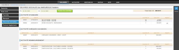 PRONIS affiche le détail dans les onglets ci- dessous en fonction du salarié Amouroux. Par défaut PRONIS affiche les activités consommées et le total de l’aide du CE