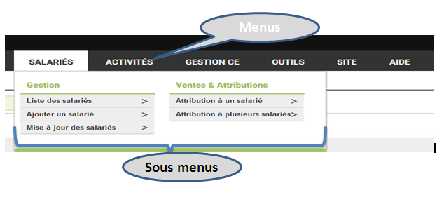 Chaque menu est représenté par un titre différent. Lorsque l’on clique sur un menu, un sous menu apparait suivant le contexte.